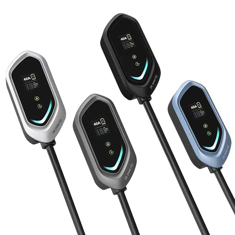 Charger functions: with display, current switching (13A 16A 25A 32A), timed charging (1-9 hours)